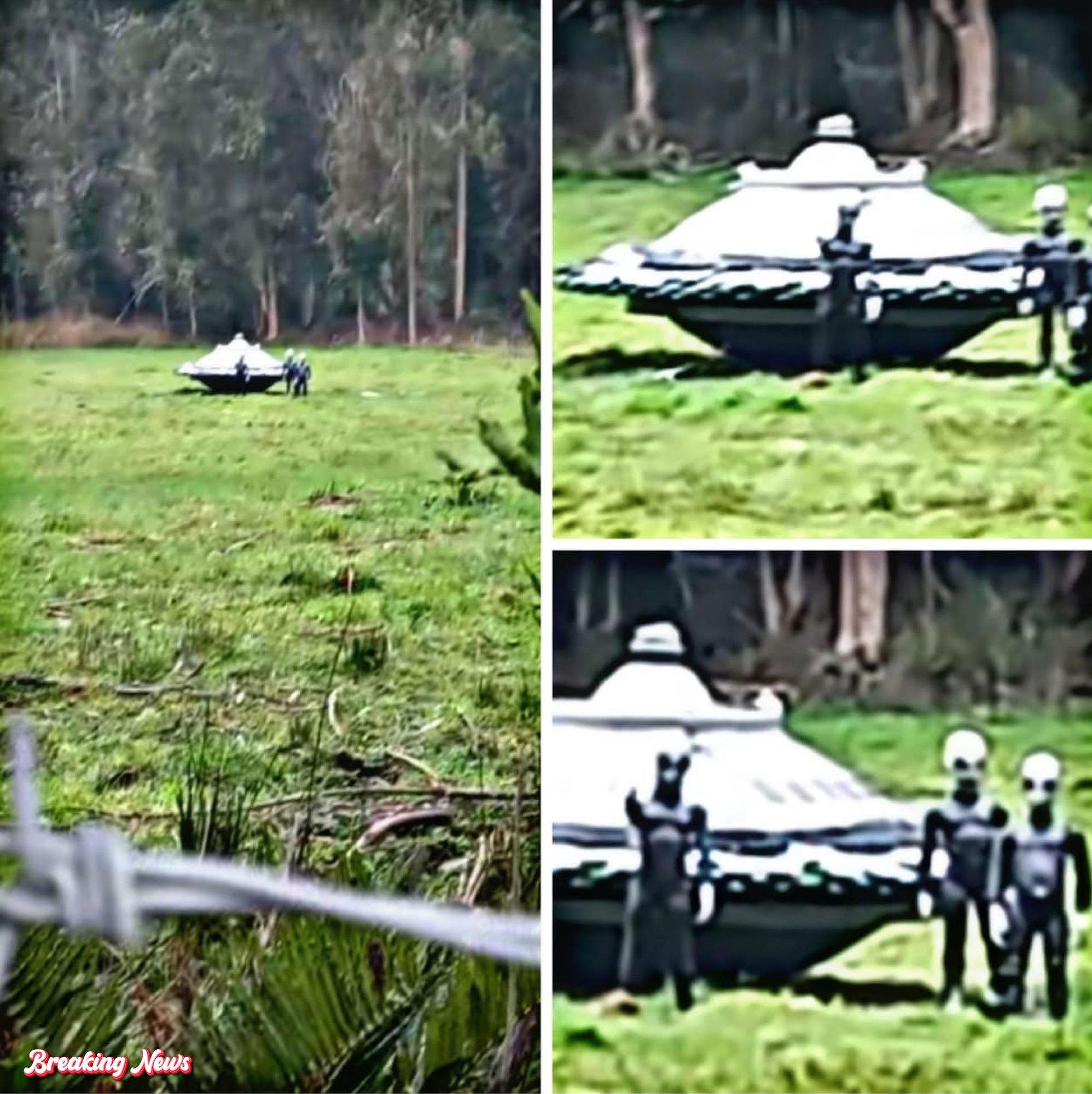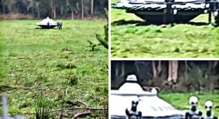 What appears in the image before us is not merely a blurred frame extracted from a low-resolution video or a sensational still shared under the label of “Breaking News,” but a visual fragment that fits disturbingly well into a pattern that has been quietly accumulating across decades of human observation, speculation, and classified testimony. This pattern suggests that the phenomenon we loosely call UFOs—or, in modern terminology, UAPs—may represent not random anomalies but deliberate manifestations of an intelligence originating beyond Earth, or even from a neighboring planetary system hidden from conventional astronomical detection. The scene depicts a disc-shaped craft resting on a grᴀssy clearing at the edge of a dense forest, its surface metallic yet matte, lacking visible propulsion exhaust, wheels, or aerodynamic features. Accompanying it are three humanoid figures whose proportions, posture, and apparent protective suits diverge subtly yet unmistakably from known human design, echoing countless encounter reports dating back to the mid-20th century.